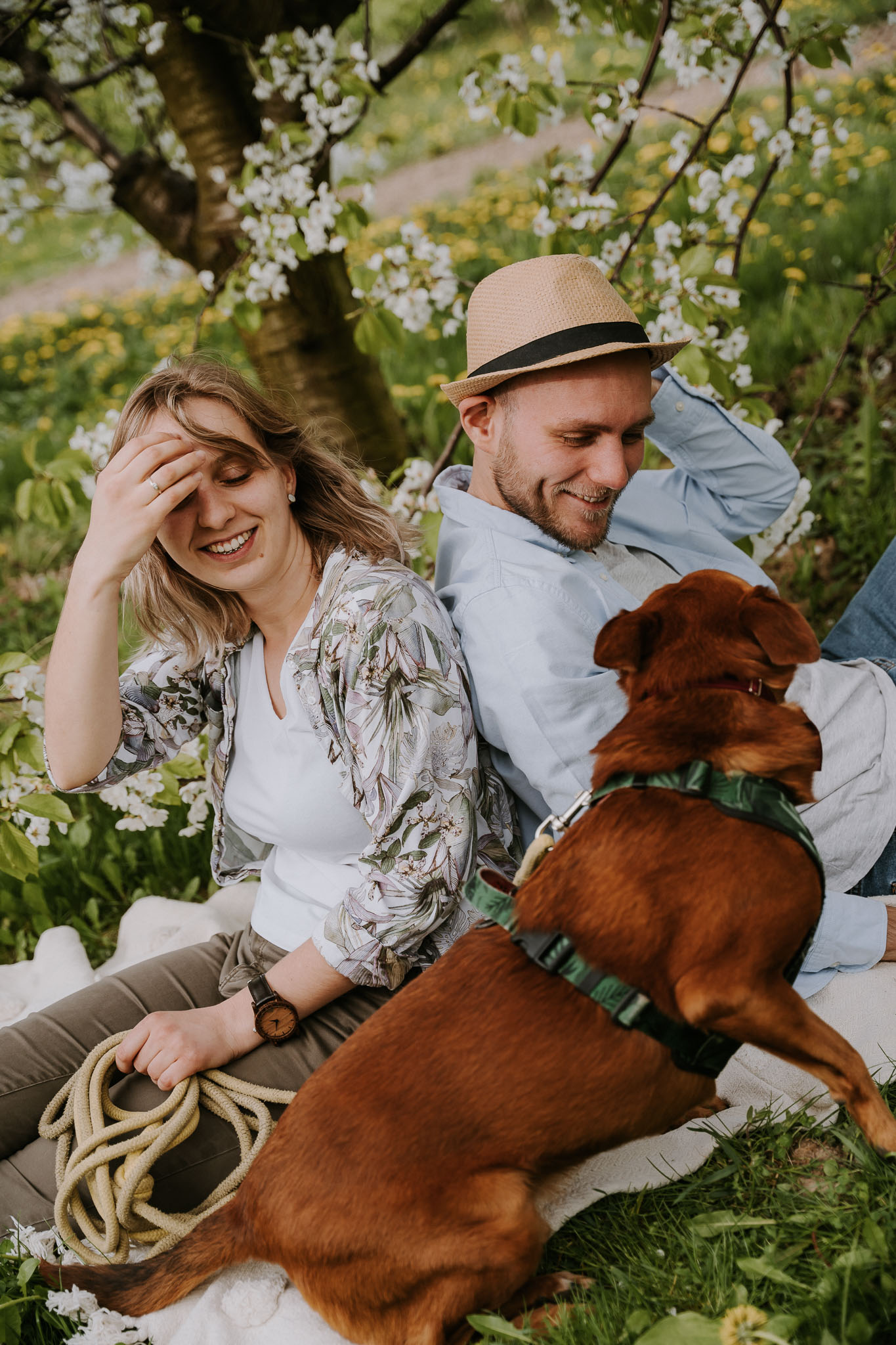 Sesja narzeczeńska w kwitnącym sadzie jabłoni